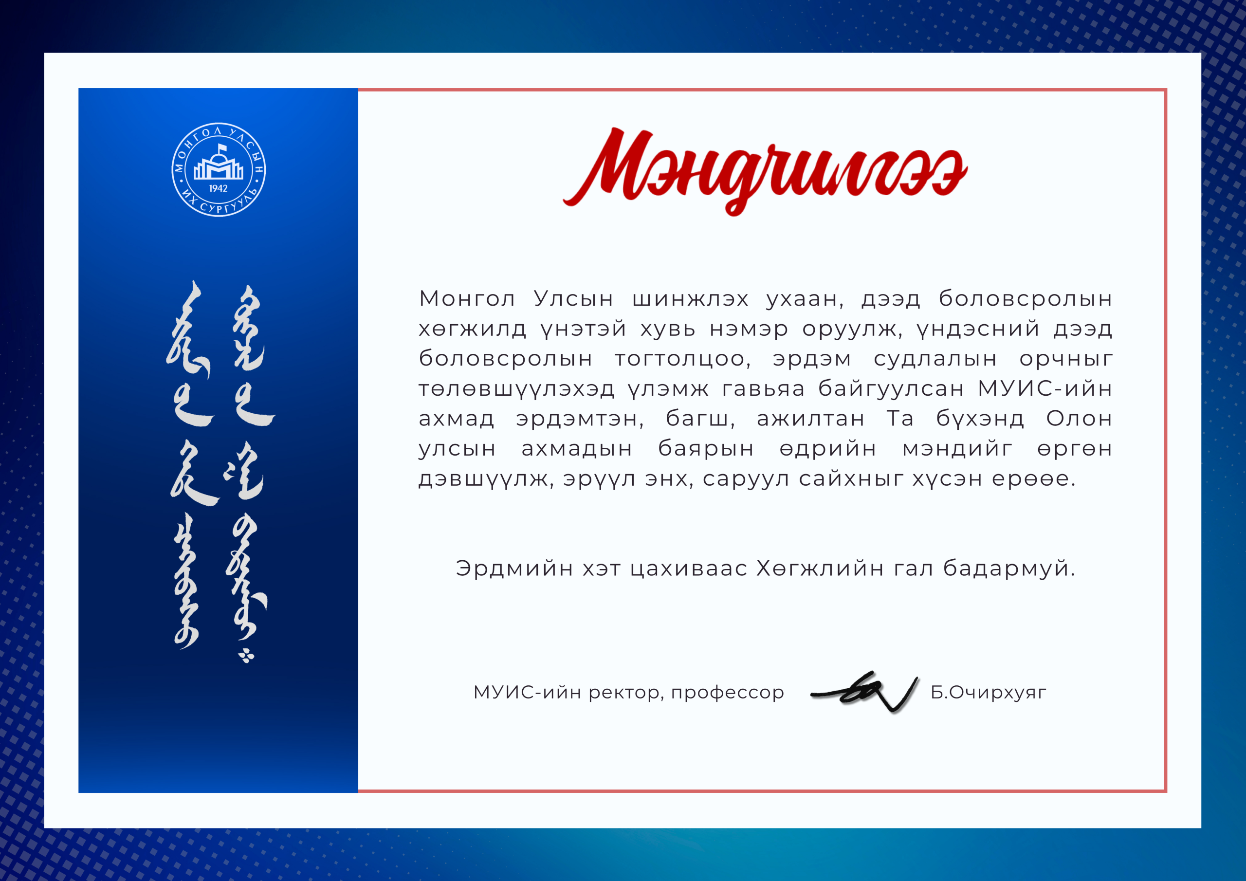 Монгол Улсын Их Сургуулийн Монгол хэл, хэл шинжлэлийн тэнхим Монгол Улсын Их Сургуулийн профессор Мөнхжаргалын Базаррагчаагийн 80 насны ойд зориулсан эрдэм шинжилгээний хурлыг зохион байгууллаа. Энэхүү эрдэм шинжилгээний хуралд Монгол Улсын Их Сургууль, Монгол Улсын ...