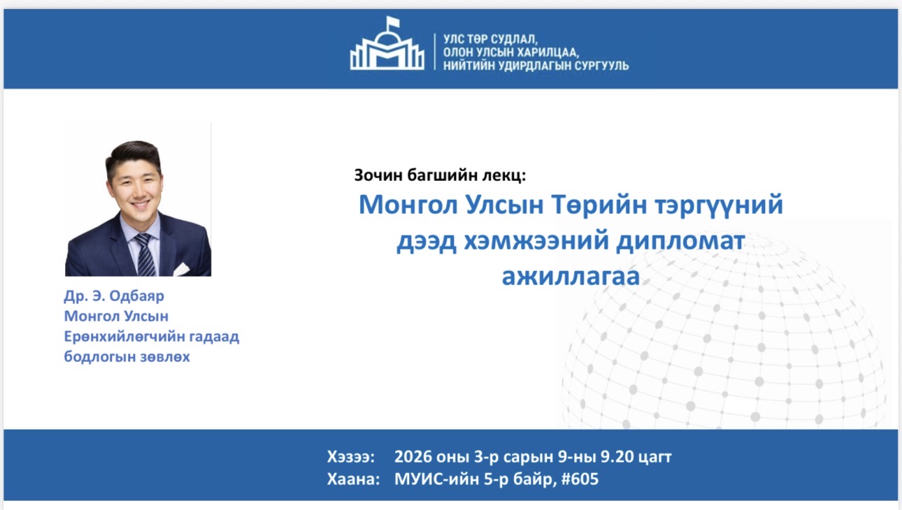 Монгол Улсын Ерөнхийлөгчийн гадаад бодлогын зөвлөх, Онц бөгөөд Бүрэн эрхт Элчин сайд, Др. Э.Одбаяр МУИС-ийн УТСОУХНУС-ийн багш, оюутнуудад зориулан “Монгол Улсын Төрийн тэргүүний дээд хэмжээний дипломат ажиллагаа” сэдвээр лекц уншина. Лекц 2026 оны 3-р сарын ...