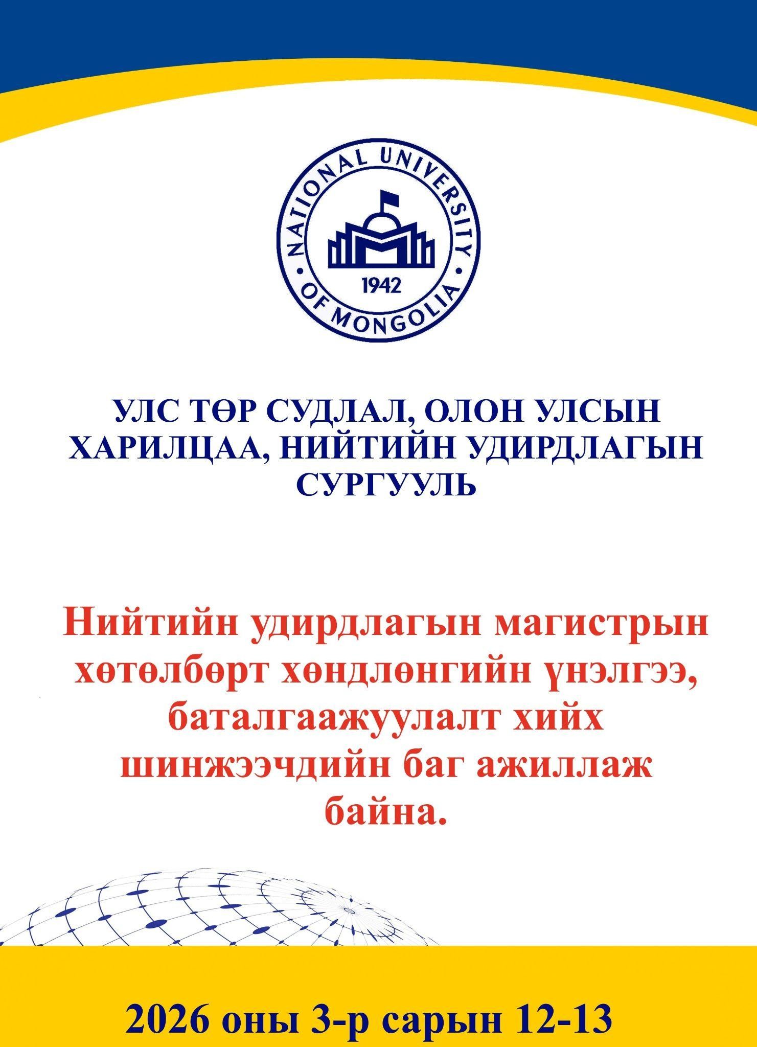 Монгол Улсын Их Сургууль болон БНСУ-ын Пусаны Үндэсний Их Сургууль (ПҮИС)-ийн хооронд байгуулсан хамтын ажиллагааны гэрээний хүрээнд 2026-2027 оны хичээлийн жилийн намрын улиралд ПҮИС-ийн оюутан солилцооны хөтөлбөрт суралцахыг урьж байна. Ерөнхий мэдээлэл: Солилцооны хөтөлбөрийн цахим ...