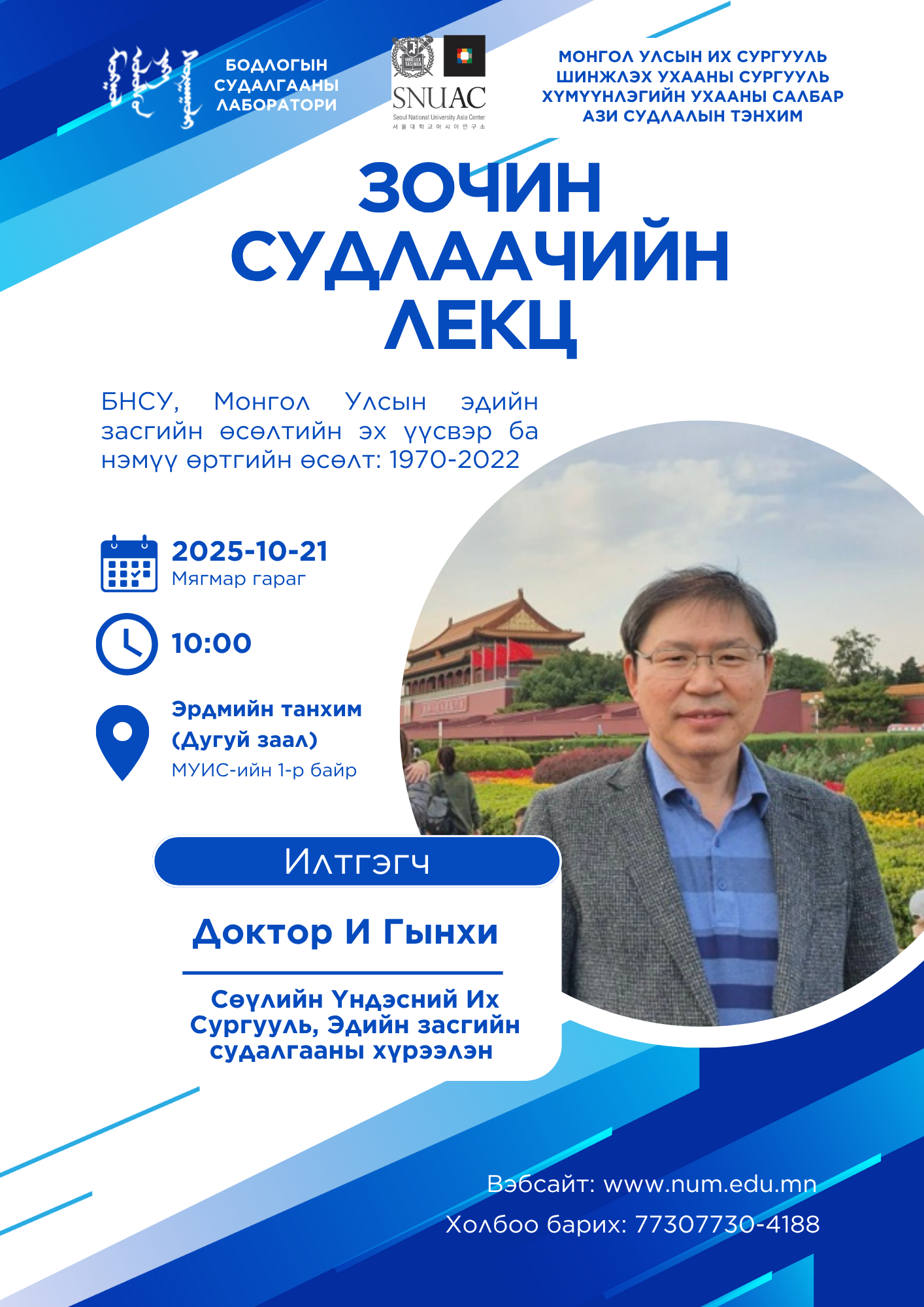 МУИС-ийн Бодлогын Судалгааны Лаборатори, Ази судлалын тэнхим болон Сөүлийн Үндэсний Их Сургуулийн Ази судлалын төв хамтран зохион байгуулж буй “Зочин судлаачийн лекц”-д эрдэмтэн судлаач, оюутан суралцагч Та бүхнийг хүрэлцэн ирэхийг урьж байна. Илтгэгч: И Гынхи ...