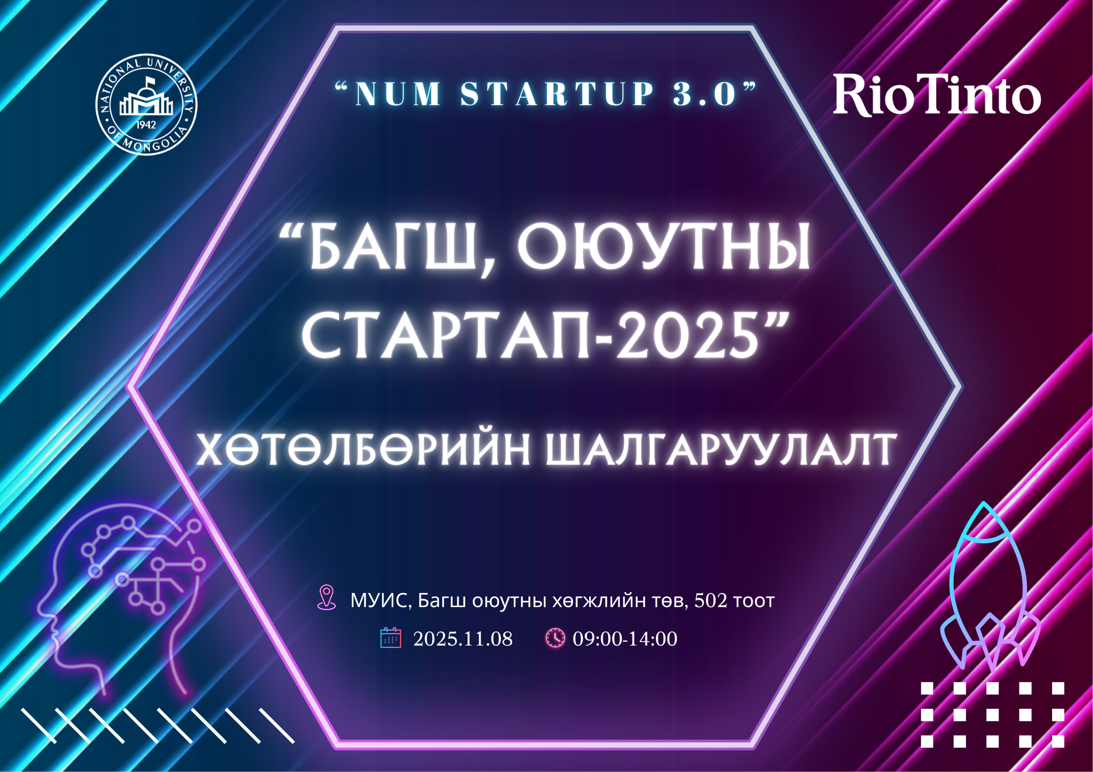 “Багш, оюутны стартап-2025” (NUM STARTUP 3.0) хөтөлбөрийн шалгаруулалтын үйл ажиллагаанд урьж байна