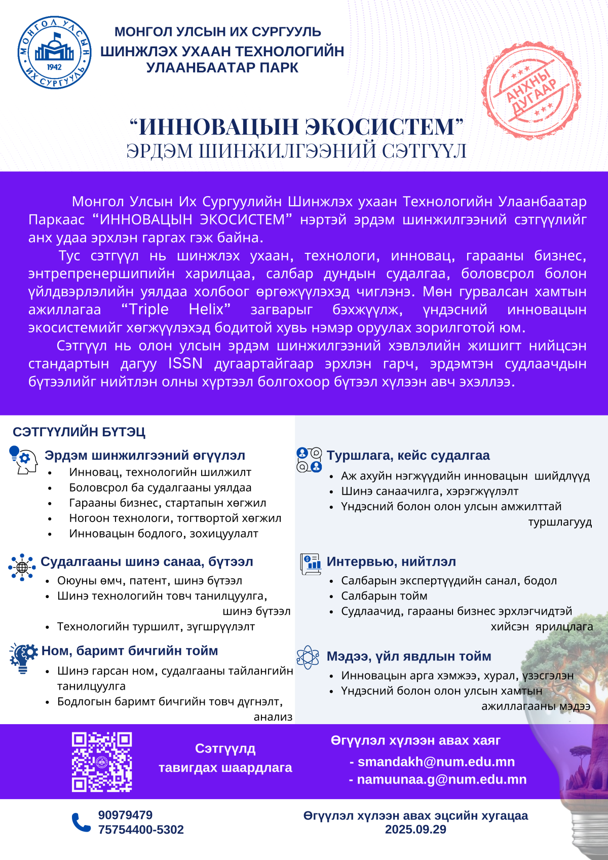 “ИННОВАЦЫН ЭКОСИСТЕМ” эрдэм шинжилгээний сэтгүүлд бүтээл хүлээн авч эхэллээ 2025-09-18 МУИС-ийн Шинжлэх Ухаан Технологийн Улаанбаатар Паркаас эрхлэн гаргаж буй “ИННОВАЦЫН ЭКОСИСТЕМ” эрдэм шинжилгээний сэтгүүлд бүтээл хүлээн авч эхэллээ. Багш, судлаач та бүхнийг эрдэм шинжилгээний бүтээлээ ирүүлэхийг урьж байна.