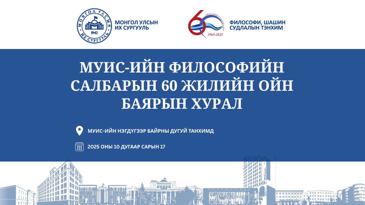 Монгол Улсын Их Сургуульд философийн мэргэжилтэн бэлтгэж эхэлснээс хойш нэгэн жаран өнгөрч байна. Улс орны боловсрол, шинжлэх ухааны хөгжилд үнэтэй хувь нэмэр оруулсан энэхүү салбар үүсэж хөгжсөний түүхэн ойг 2025 оны 10 дугаар сарын 17-ны өдөр тэмдэглэн өнгөрүүлнэ.