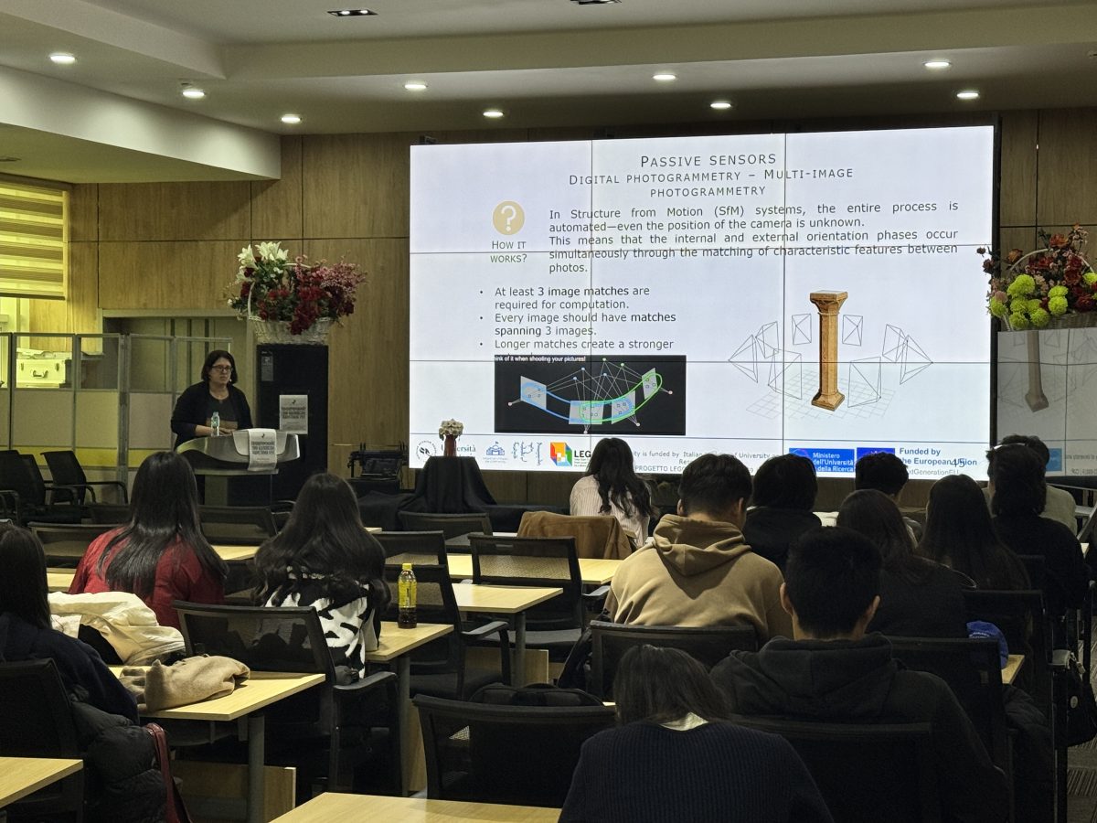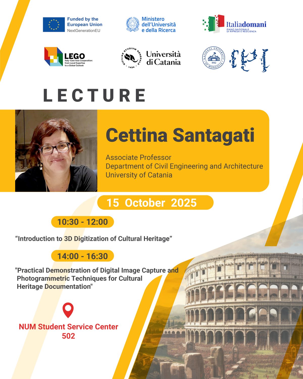 Мөн профессор Четтина Сантагати МУИС-ийн оюутнуудад зориулан “Соёлын өвийн 3D дижиталчлалын үндэс” болон “Соёлын өвийг баримтжуулах фотограмметрийн практик аргачлал” сэдвээр лекц уншиж, соёлын болон архитектурын өвийн хадгалалт, хамгаалалтад дижитал технологийг ашиглах шинэлэг арга зүйг танилцууллаа. Тэрээр оюутнуудад зургийн аппарат ашиглан 3D загвар үүсгэх фотограмметрийн үйл явцыг үзүүлж, практик туршлага хуваалцсан юм.