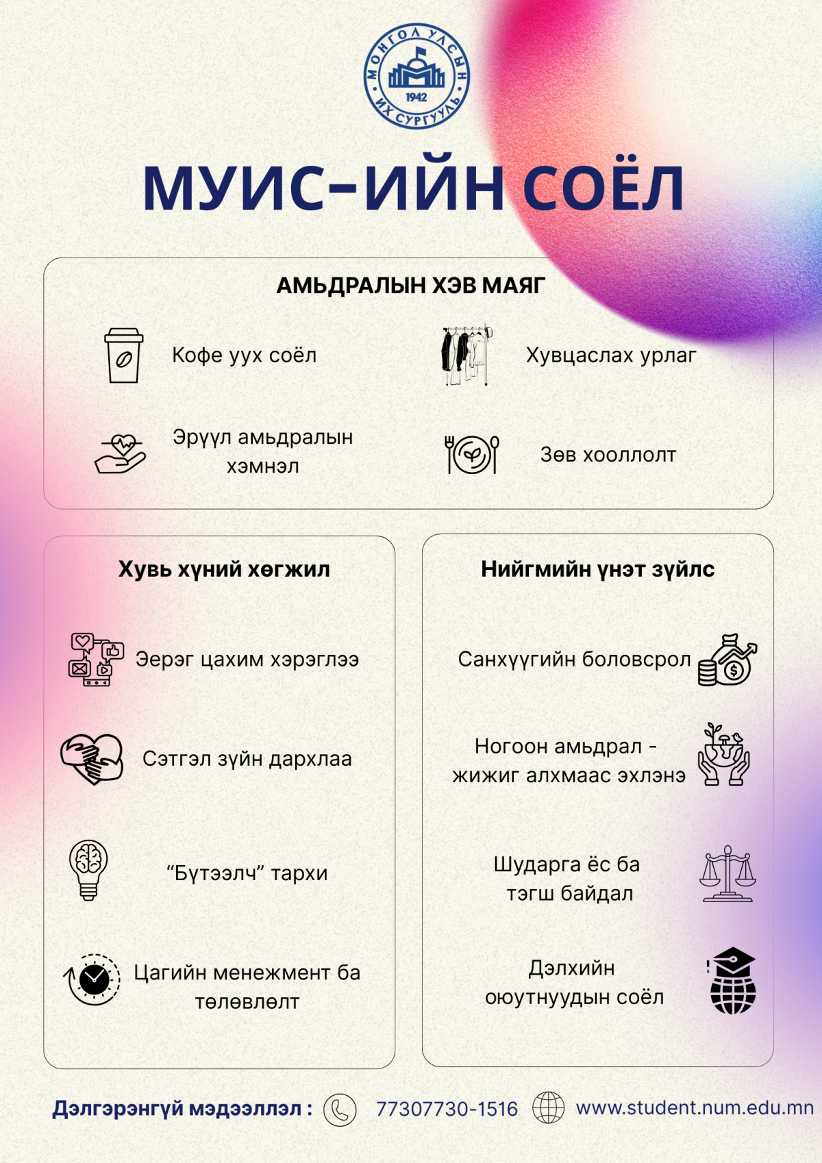 МУИС-ийн Оюутны хөгжлийн хөтөлбөрийн хүрээнд хувь хүний хөгжил, зөөлөн ур чадварыг дэмжих зорилгоор “МУИС-ийн СОЁЛ” цуврал сургалтыг Оюутны хөгжлийн газраас зохион байгуулж эхэллээ.