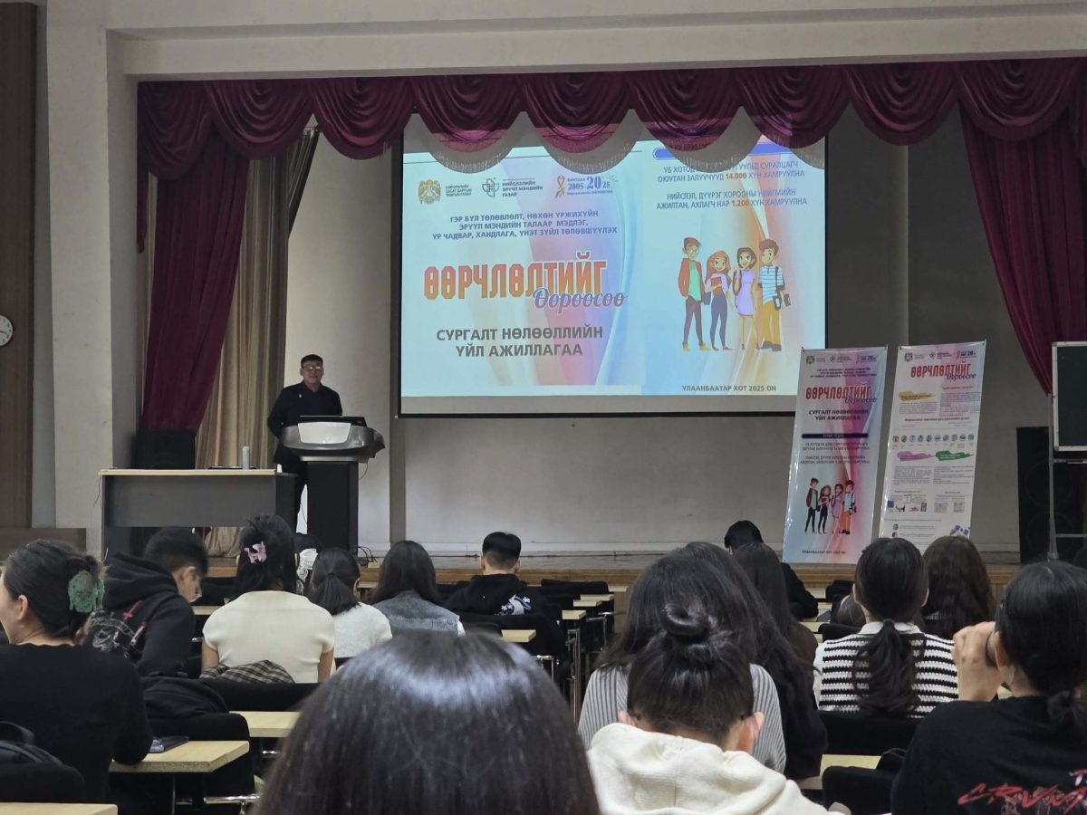 Нийслэлийн эрүүл мэндийн газар (НЭМГ) болон Боловсролын ерөнхий газар (БЕГ)-аас хэрэгжүүлж буй оюутан залуусын гэр бүл төлөвлөлт, нөхөн үржихүйн эрүүл мэндийн талаарх мэдлэг мэдээллийг нэмэгдүүлэх, БЗДХ болон үр хөндөлтөөс урьдчилан сэргийлэх чиглэлийн хүрээнд зохион байгуулагдаж буй “Өөрчлөлтийг өөрөөсөө 2025” аяныг Монгол Улсын их дээд сургуулиудын оюутан суралцагчдын хүрээнд зохион байгуулж байгаа юм.