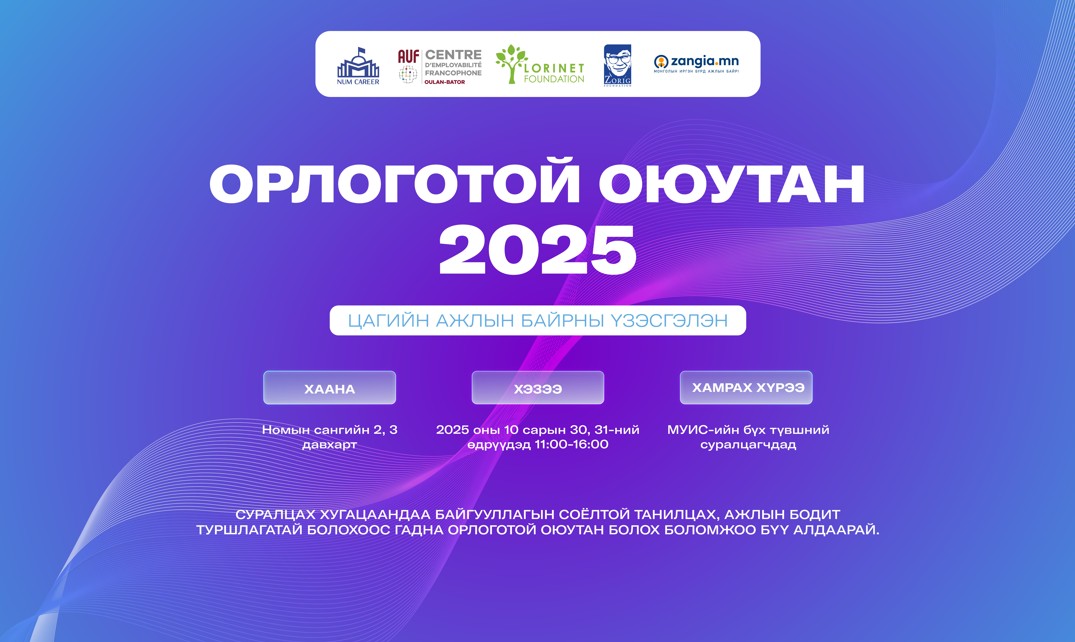 МУИС-ийн Оюутны хөгжлийн газар нь МУИС-ийн Францын хамтын ажиллагааны төв, Зориг сан, Зангиа Портал ХХК-тай хамтран “Орлоготой оюутан – Цагийн ажилд зуучлах өдөрлөг”-ийг 2025 оны 10-р сарын 30–31-ний өдрүүдэд МУИС-ийн Номын санд амжилттай зохион байгууллаа.