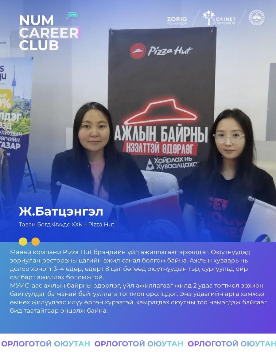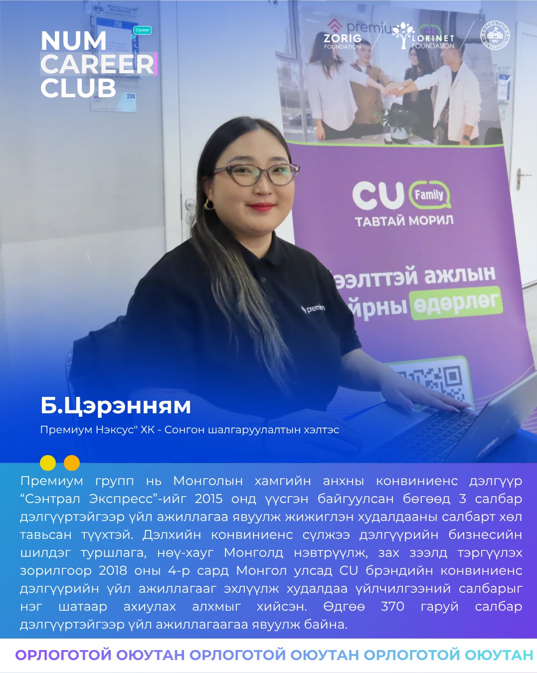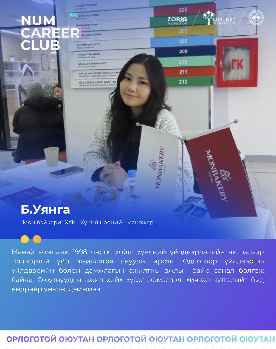 Мөн NUM Career клуб өдөрлөгийн үеэр өөрсдийн үйл ажиллагааг танилцуулан, ажлын байранд шаардлагатай ур чадваруудын талаар оюутнуудад зөвлөгөө өгч, ажлын ярилцлагад бэлтгэх ганцаарчилсан зөвлөгөөг санал болгосон юм.