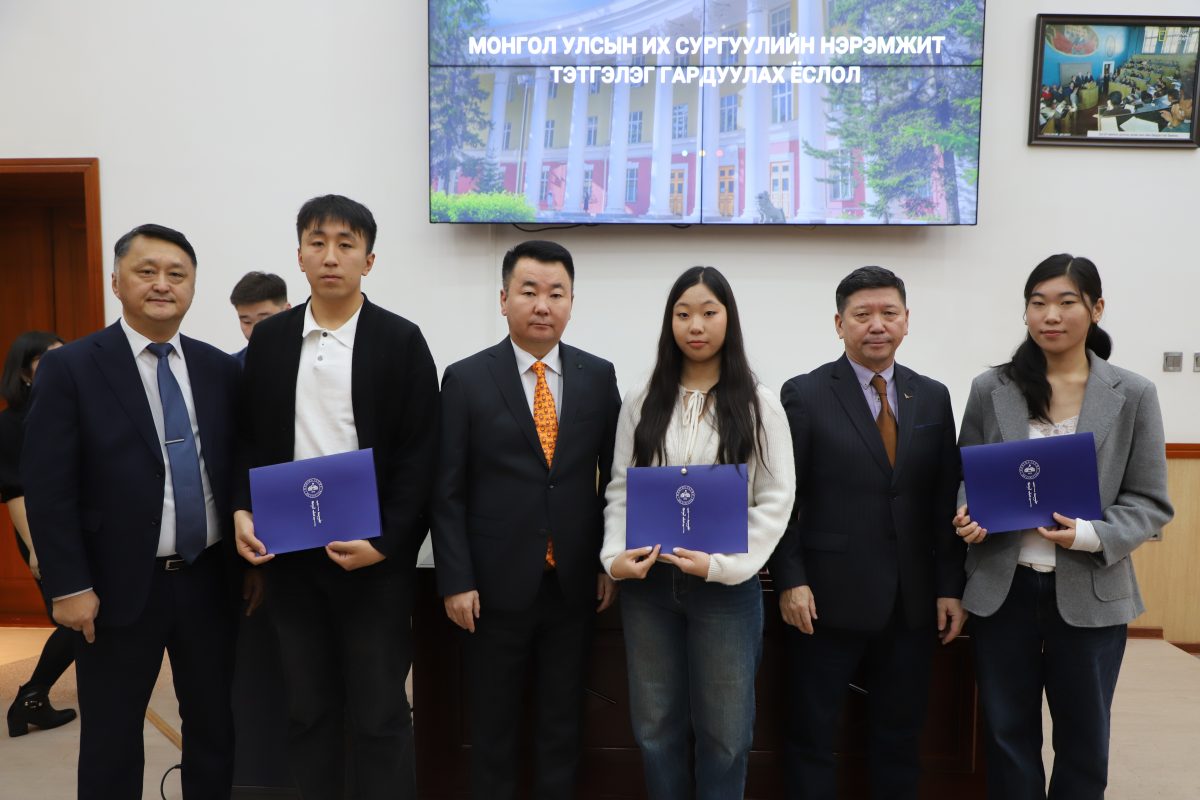 2025-2026 оны хичээлийн жилд МУИС-ийн нэрэмжит тэтгэлгийн журмын дагуу МУИС-ийн нэрэмжит тэтгэлгийг олгож, тэтгэлэг гардуулах нэгдсэн ёслолыг хөтөлбөр, удирдамжийн дагуу зохион байгууллаа.