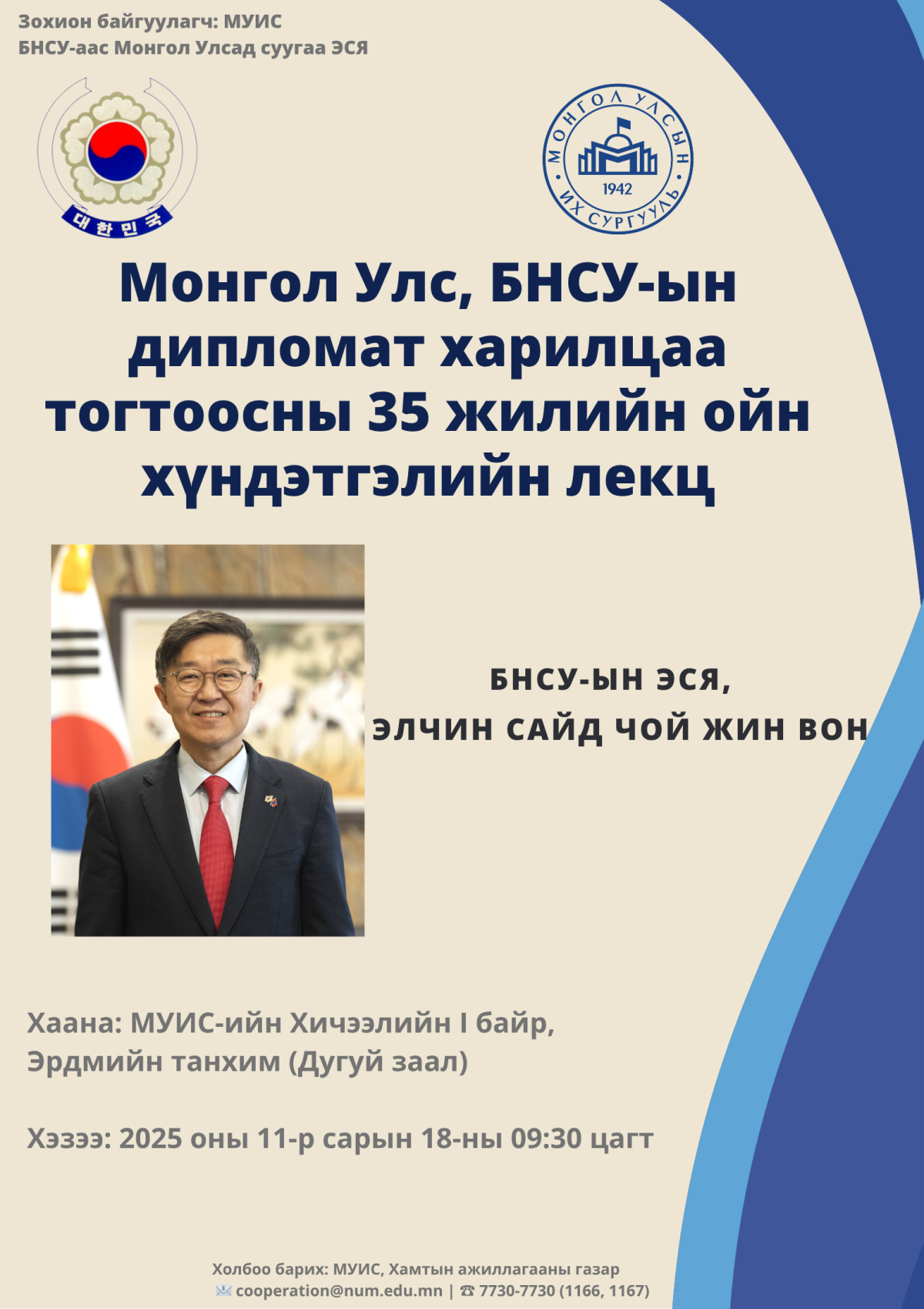 Монгол Улс болон Бүгд Найрамдах Солонгос Улсын хооронд дипломат харилцаа тогтоосны 35 жилийн ойг тохиолдуулан БНСУ-аас Монгол Улсад суугаа Онц бөгөөд Бүрэн эрхт Элчин сайд Чой Жин Вон МУИС-ийн багш, судлаач, оюутнуудад зориулан хүндэтгэлийн лекц тавих гэж байна.