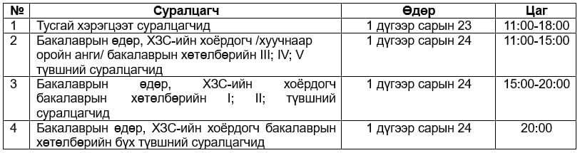 2025-2026 оны хичээлийн жилийн хаврын улирлын ахисан түвшин, ХЗС-ийн хоёрдогч бакалавр (хуучнаар эчнээ анги) -ын суралцагчдын хичээл сонголт, баталгаажуулалт 2026 оны 2 дугаар сарын 25-ны өдрийн 11:00 цагаас 3 дугаар сарын 1-ний өдрийн 17:30 цагийн хооронд явагдана. Хичээл 3 дугаар сарын 2-ны өдрөөс эхэлнэ. Шинээр элссэн, шилжиж ирсэн суралцагч 2026 оны 2 дугаар сарын 20-ны өдрөөс 2 дугаар сарын 24–ний өдрүүдэд хувийн суралцах төлөвлөгөө хийнэ.