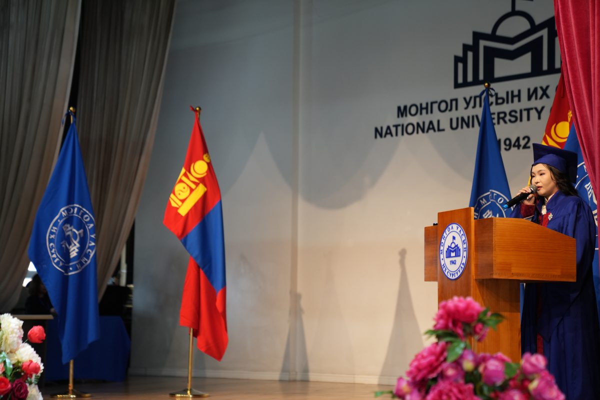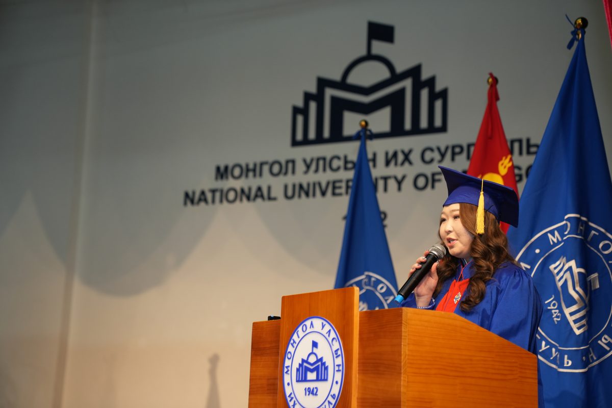 Төгсөгчдийн төлөөлөл Ц.Жавхлан хэлэхдээ: “Өнөөдөр бидний зогсож буй энэ тайз бол төгсгөл биш, харин дараагийн алхмын эхлэл юм. МУИС бидэнд зөвхөн хичээл заагаагүй, харин асуулт асууж сургах, өөрийнхөөрөө бодох, аливааг өөр өнцгөөс харах дадлыг өгсөн сургууль байлаа. Тиймдээ ч “Эрдмийн хэт цахиваас, хөгжлийн гал бадармуй” гэх уриа бидний дотор аяндаа нутагшсан биз ээ.