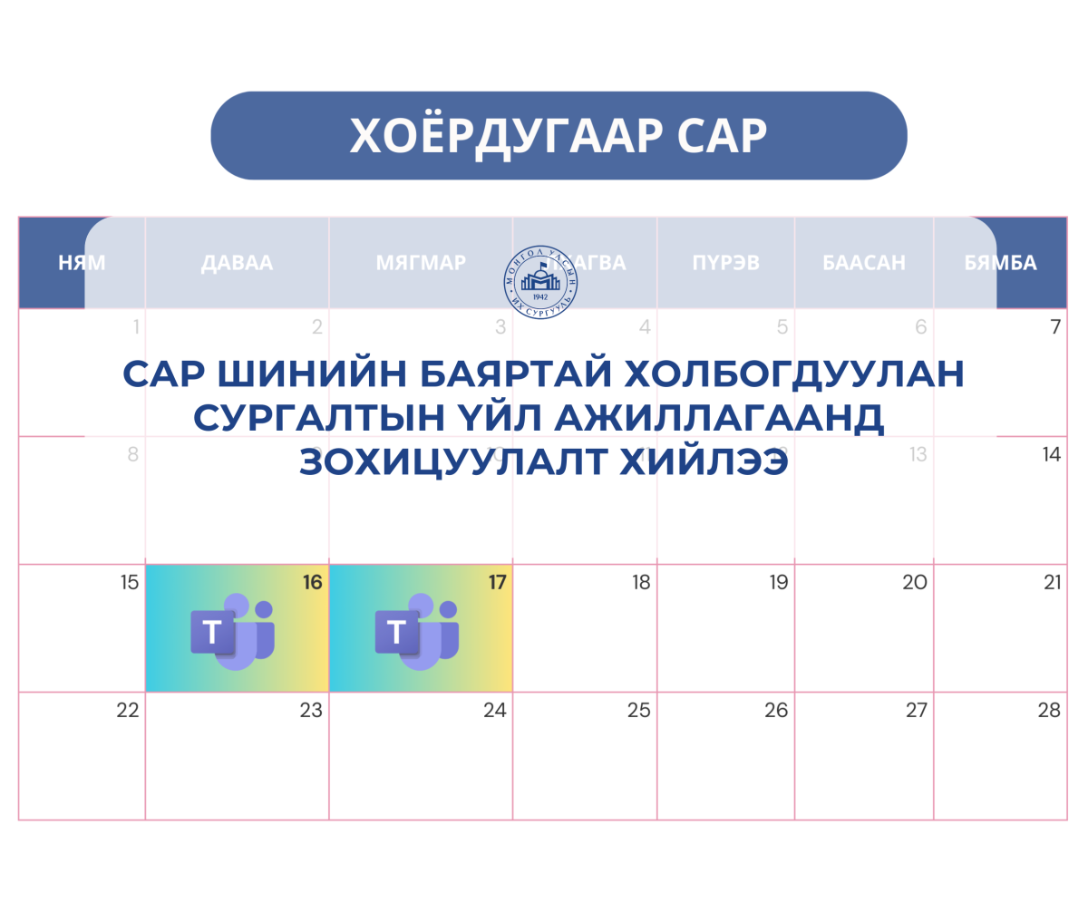 Сар шинийн баяртай холбогдуулан 2026 оны 2 дугаар сарын 16, 17-ны өдрийн хичээлийг цахим хэлбэрээр буюу Microsoft teams group-ээр орохоор боллоо.