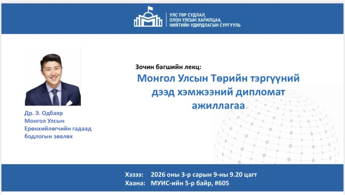 Лекц 2026 оны 3-р сарын 9-ны 9.20 цагт МУИС-ийн 5-р байрны 605 тоотод болно. Та бүхнийг олон улсын харилцааны хөтөлбөрийн “Дипломат ба консулын харилцаа” хичээлийн хүрээнд зохион байгуулагдаж буй уг лекцэнд оролцохыг урьж байна.