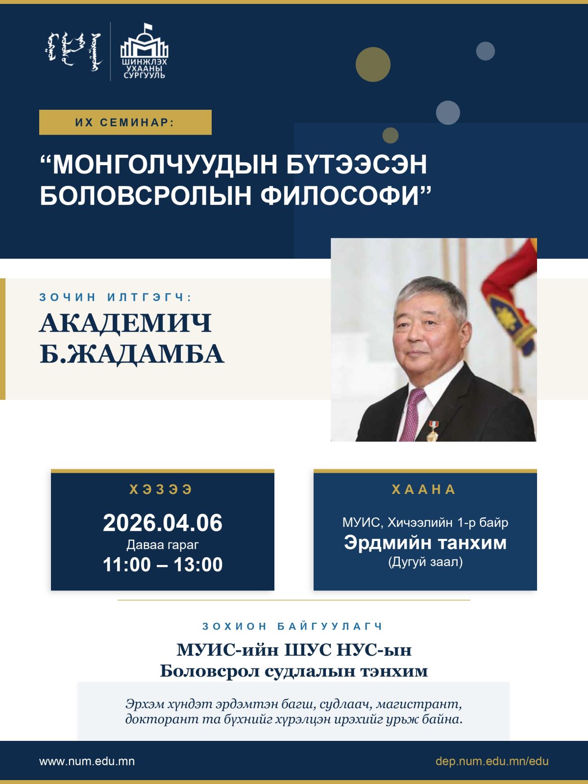 “Монголчуудын бүтээсэн боловсролын философи” их семинарт урьж байна Боловсрол судлалын тэнхим 2026-04-06 11:00 МУИС-ийн Эрдмийн танхим