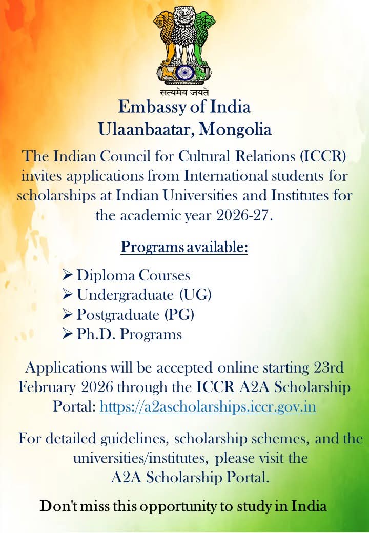 Бүгд Найрамдах Энэтхэг Улсын Элчин сайдын яамнаас Энэтхэгийн Соёлын харилцааны зөвлөл (ICCR)-өөс 2026–2027 оны хичээлийн жилд зарласан тэтгэлэгт хөтөлбөрийн талаарх мэдээлэл өгөх өдөрлөгийг зохион байгуулах гэж байна.