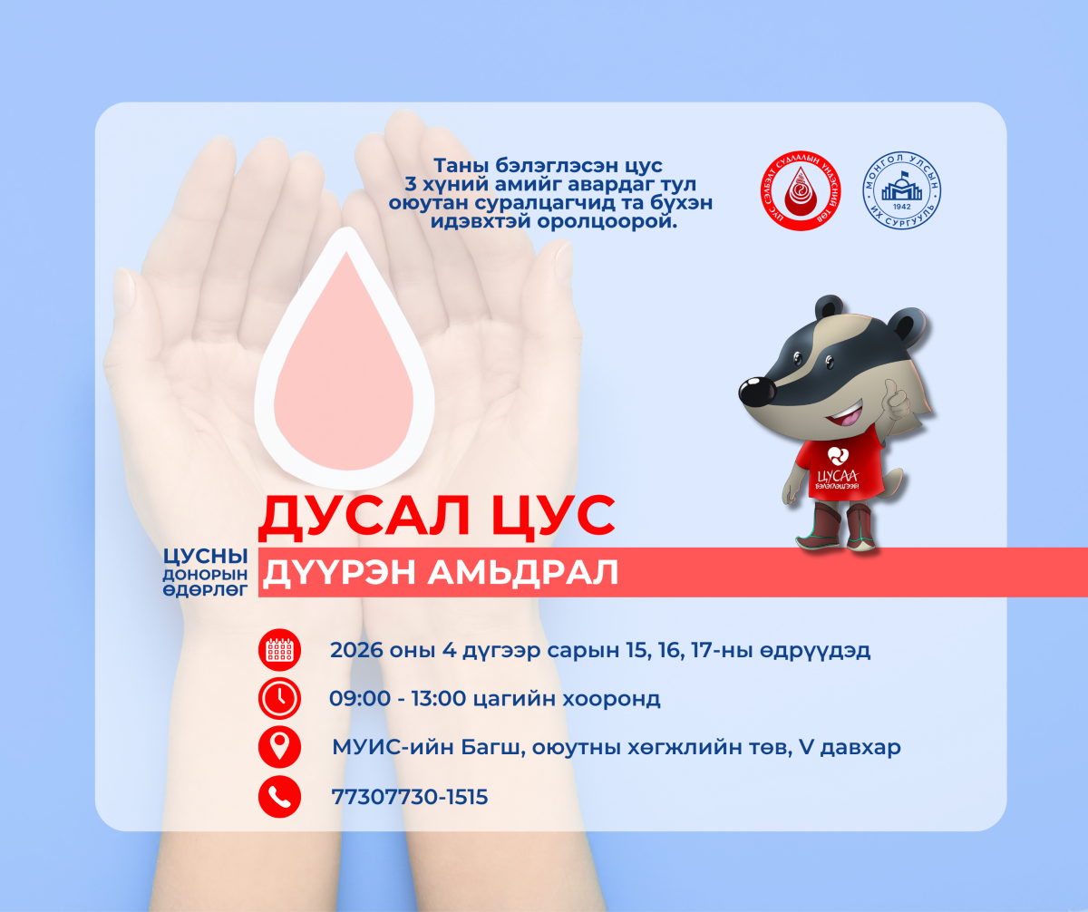 Энэ удаагийн “Дусал цус – Дүүрэн амьдрал” цусны донорын өдөрлөг нь 2026 оны 4 дүгээр сарын 15, 16, 17 -ны өдрүүдэд 3 өдрийн турш 09:00-13:00 цагийн хооронд Багш, оюутны хөгжлийн төвийн 5 давхарт зохион байгуулагдах гэж байна.