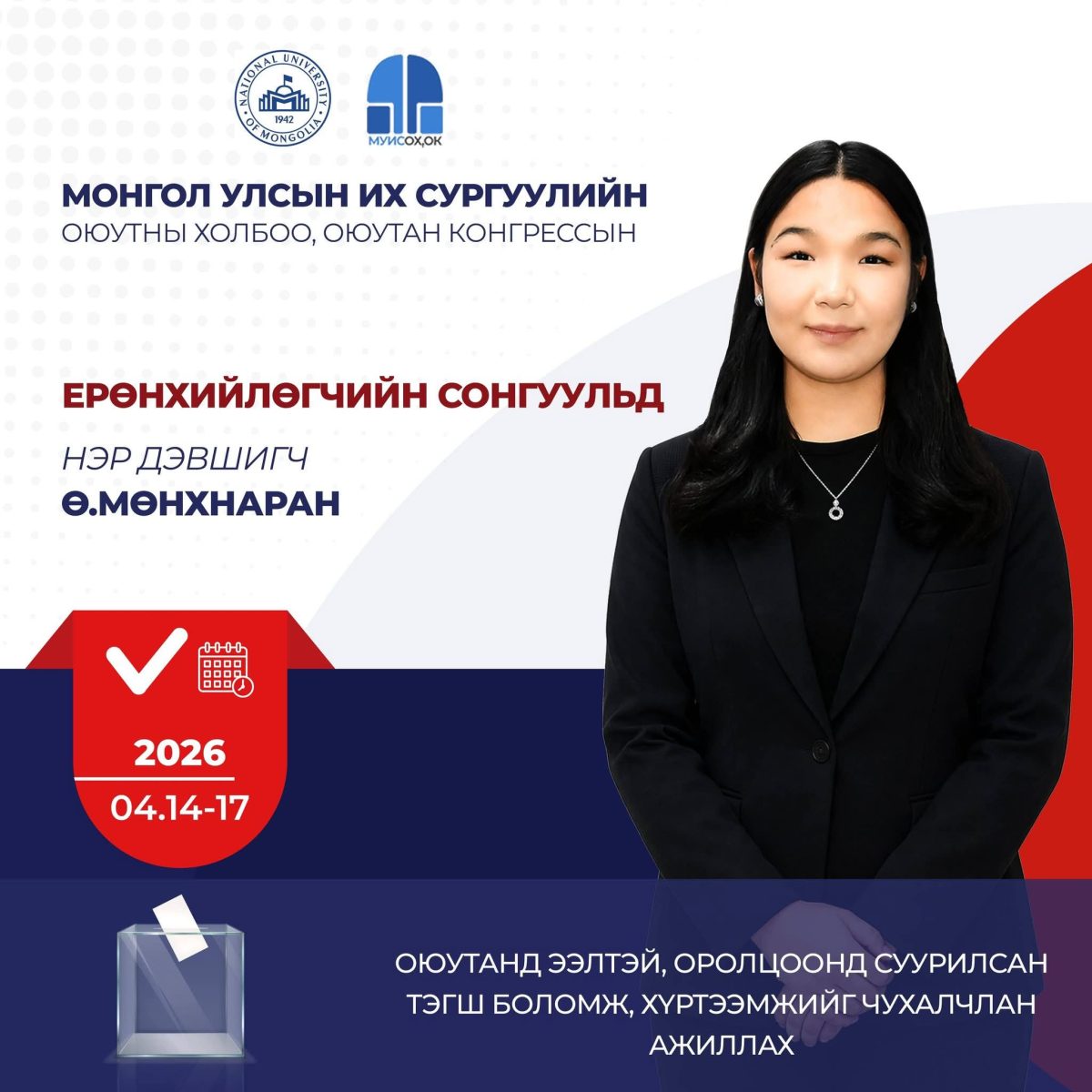 Санал хураалт нь SISI системээр цахимаар зохион байгуулагдана. МУИС-ийн нийт оюутан та бүхнийг 2026 оны 4 дүгээр сарын 14–17-ны өдрүүдэд болох сонгуульд идэвхтэй оролцохыг уриалж байна.