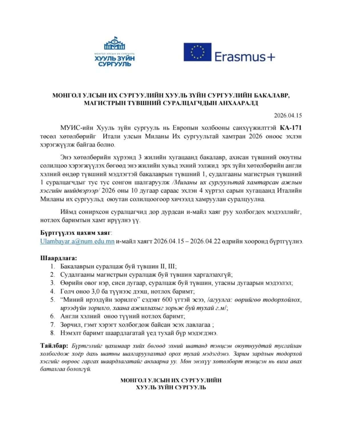 МУИС-ийн ХЗС-ийн бакалавр, магистрын түвшний суралцагчдын анхааралд