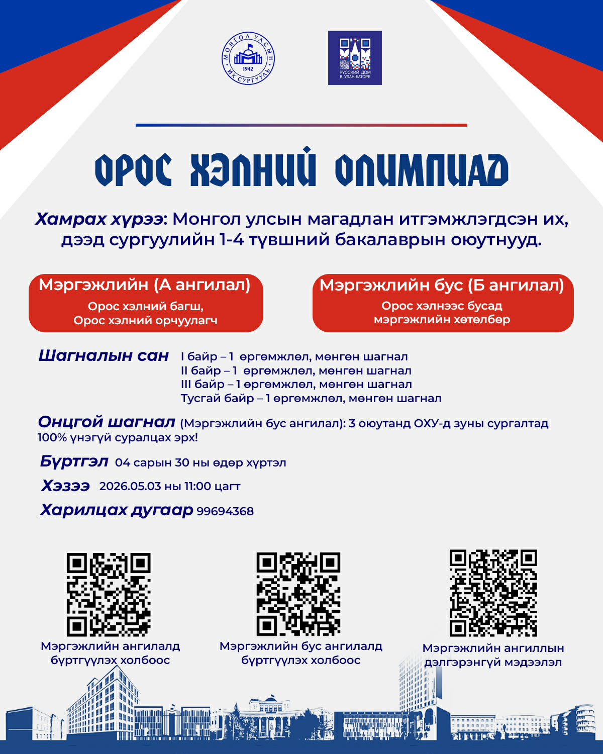 МУИС, ШУС, ХУС-ын Европ судлалын тэнхим Улаанбаатар дахь “Русский дом”-той хамтран их дээд сургуулийн оюутны Орос хэлний XIV Олимпиадыг 2026 оны 5 дугаар сарын 03-ны өдөр зохион байгуулах гэж байна.